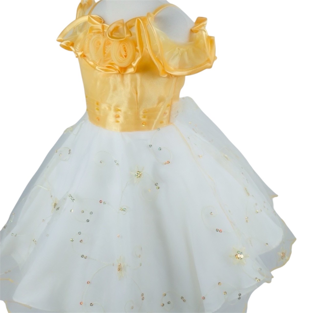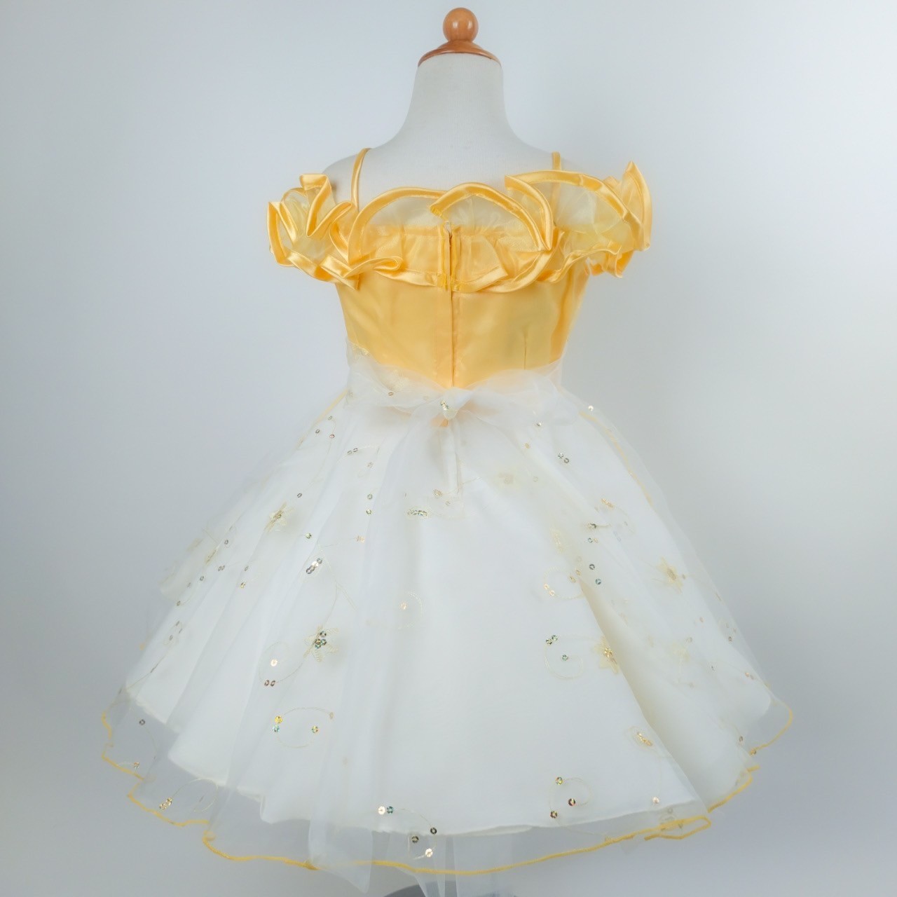 スカートのスパンコール刺繍が動くたびにキラキラと輝き、胸元のデザインが特徴的なドレスです